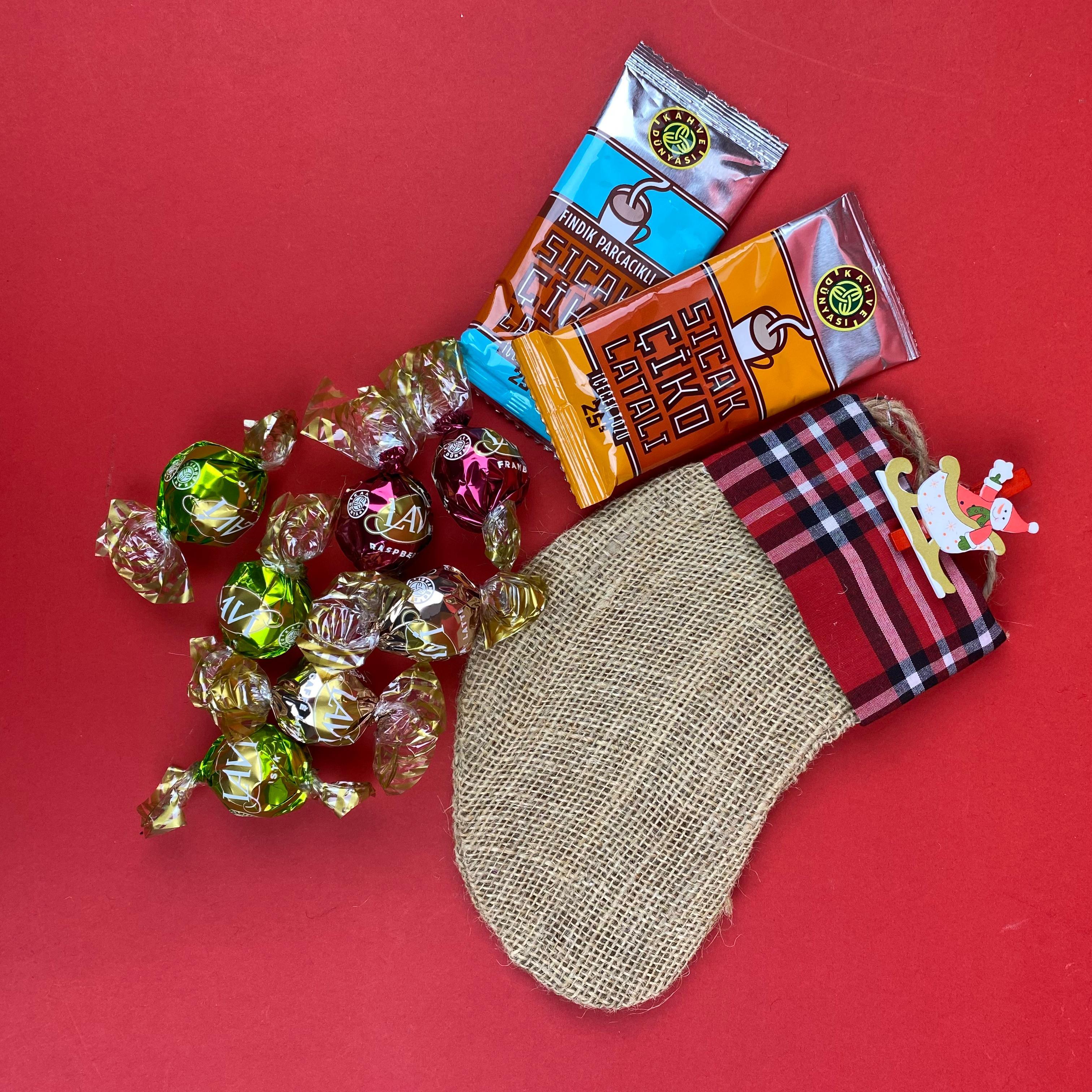 Yılbaşı çorabı içerisinde 1 adet tek pişirimlik salep ve 1 adet tek içimlik sıcak çikolata , 100 gr Lavi Çikolata yer almaktadır